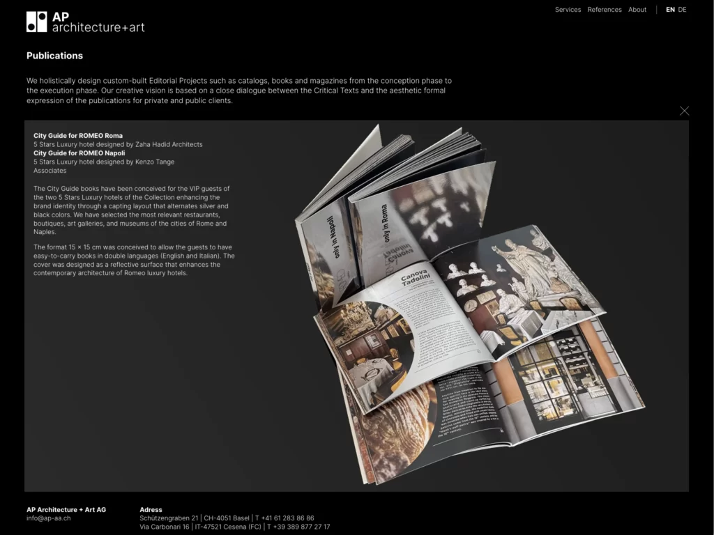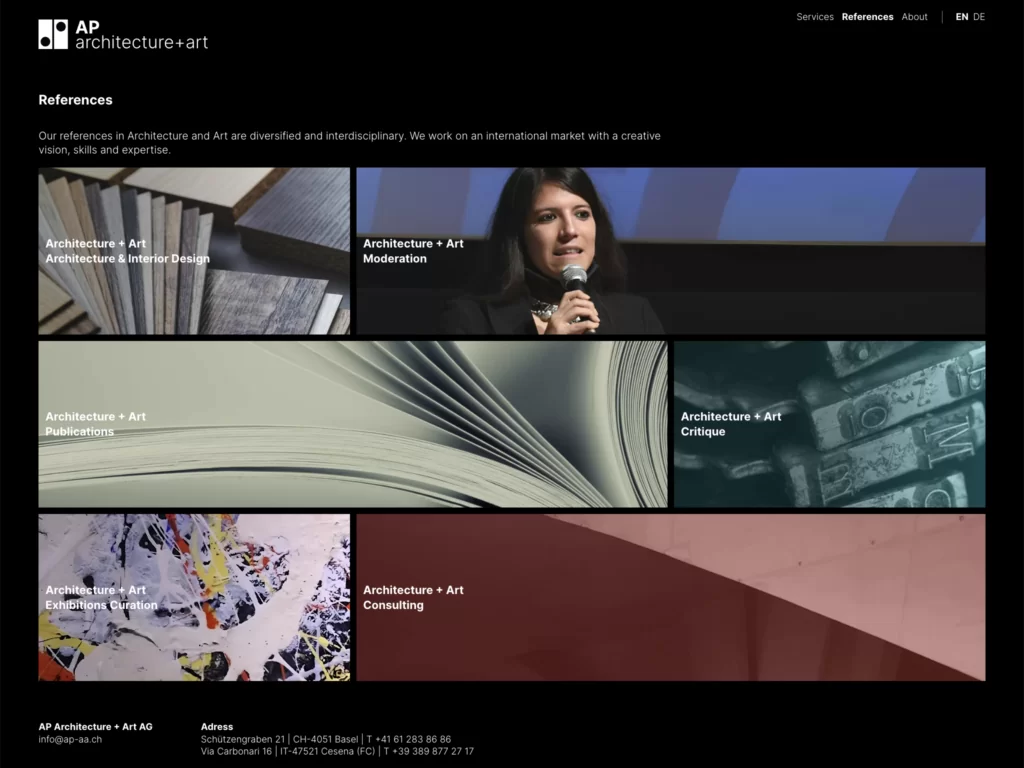 Innenarchitektur, kulturelle Dienstleistungen und künstlerische Ausstellungsprojekte. AP Architecture + Art AG entwickelt und realisiert Projekte für private und öffentliche Auftraggeber und verbindet architektonische Planung mit kuratorischen und künstlerischen Konzepten.