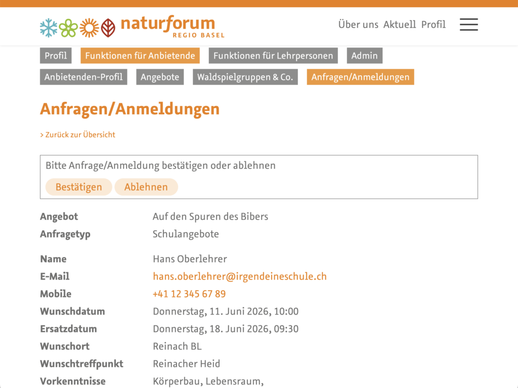 Anbietende von Naturerlebnissen können diese innerhalb der Plattform selbständig verwalten, inklusive Kursanmeldungen, Absagen, und Kursfeedback. Bei Schulangeboten werden Anträge für Förderbeiträge automatisch ausgelöst.