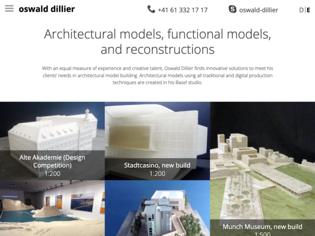 Oswald Dillier ist ein Basler Architektur- und Modellbauer, der Architekturmodelle, Funktionsmodelle und Rekonstruktionen für Architektur, Kunst und Museum realisiert. In seinem Atelier entstehen Modelle mit klassischen und digitalen Fertigungstechniken – vom Wettbewerbsmodell bis zu Ausstellungsobjekten und Prototypen.